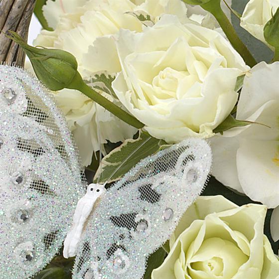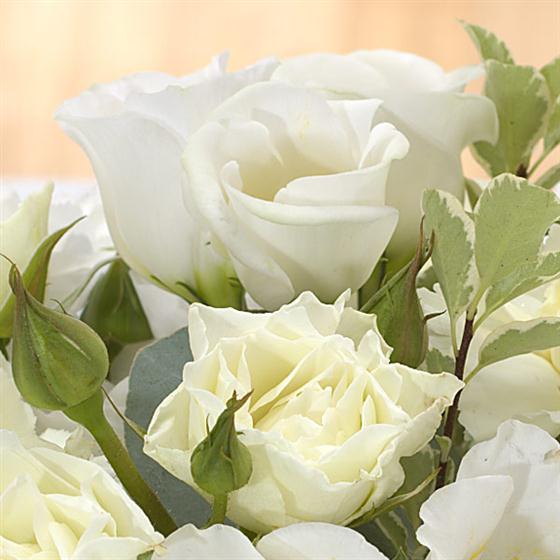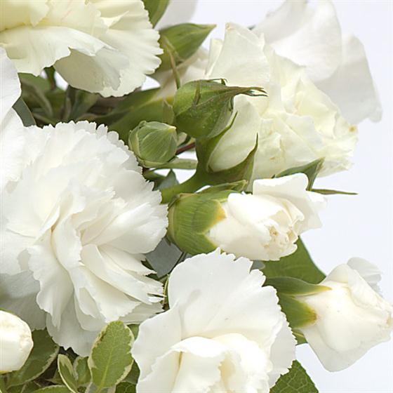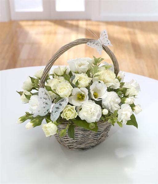 A basket arrangement all in whites: Roses, Carnations and Lisianthus.