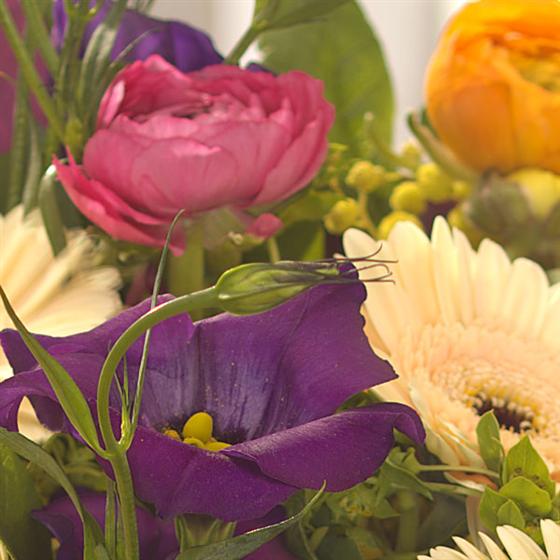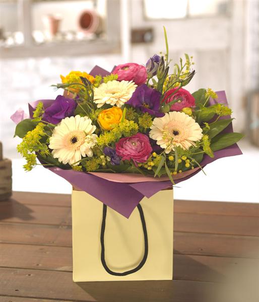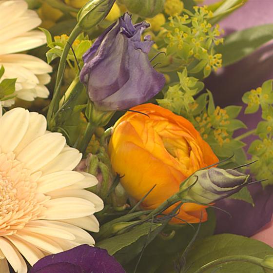 A colourful hand-tied bouquet full of fragrance and including Spring flowers,Germini and Lisianthus. Designed to go directly in a vase. Subject to availability.