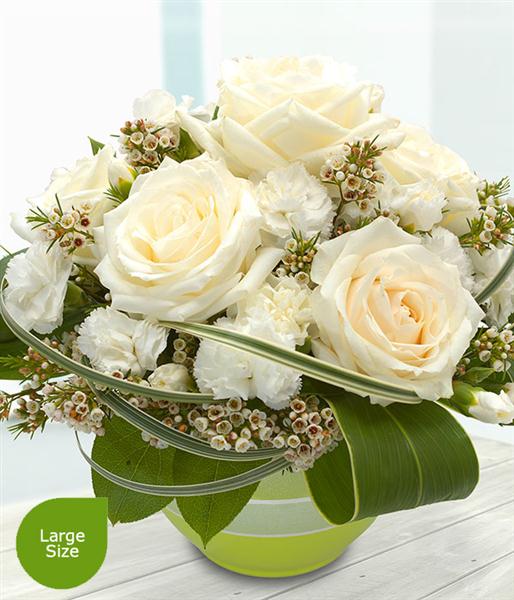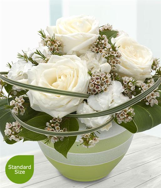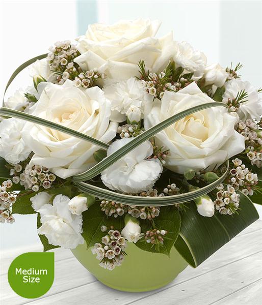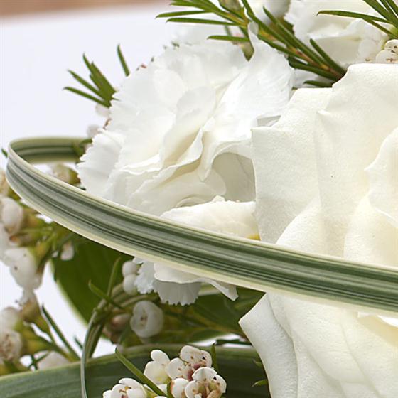 Includes White Rose, White Wax Flower, White Spray Carnation, Cordyline, Variegated China Grass, Salal.