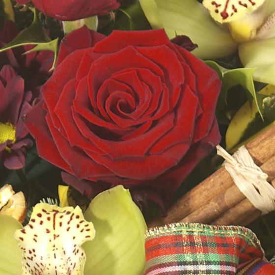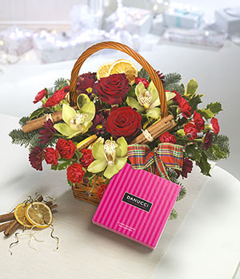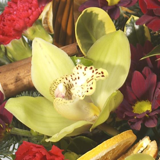 Green Cymbidium Orchids shine out amongst the red Roses, Chrysanthemums and Carnations in this Christmas basket. Pine, Holly and seasonal aromas from Cinnamon and dried Orange slices. Finished off with a box of Milk Chocolates, making it the perfect Christmas flower gift this year.