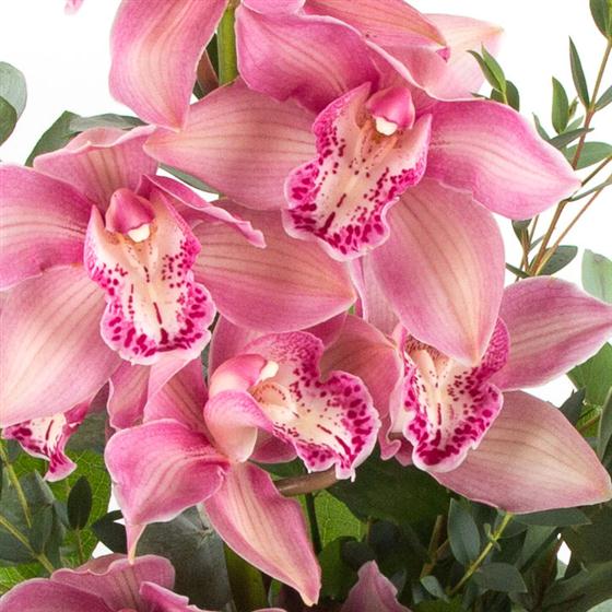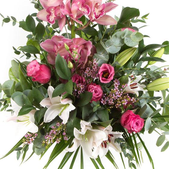 A spectacular cymbidium orchid arrangement with scented lilies, roses and delicate foliage.