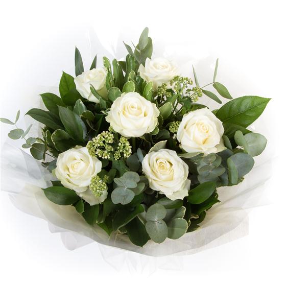Six long stemmed white roses mingled with mixed foliage presented in water.