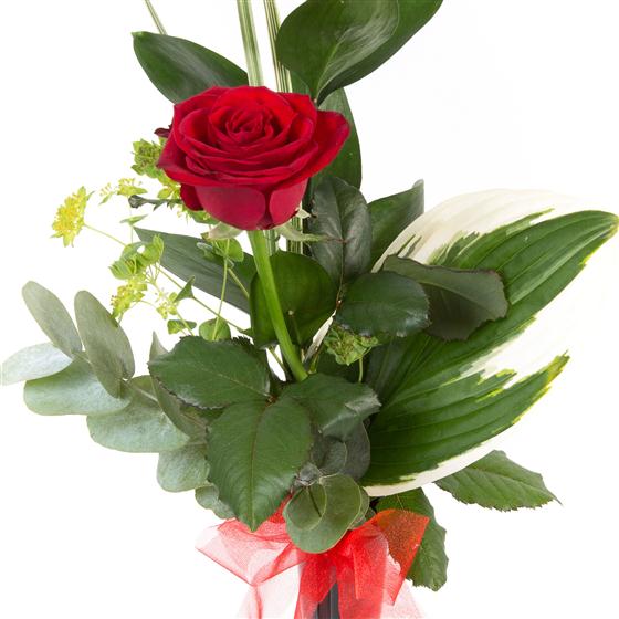 A single long stemmed red rose presented in a vase with mixed foliage sends a simple message of love.