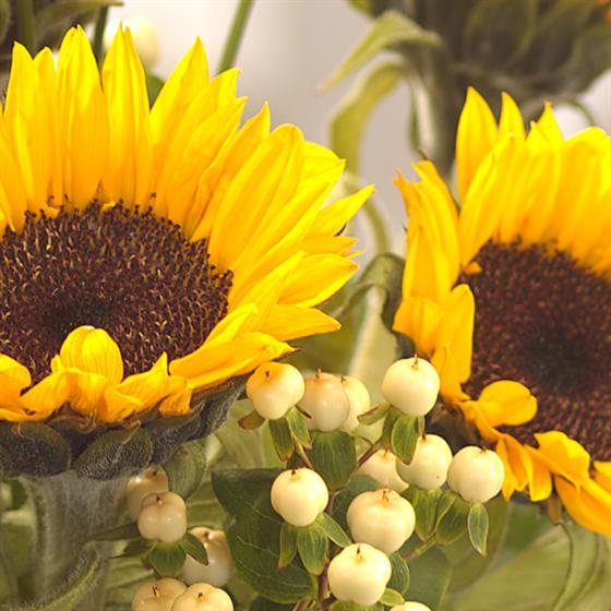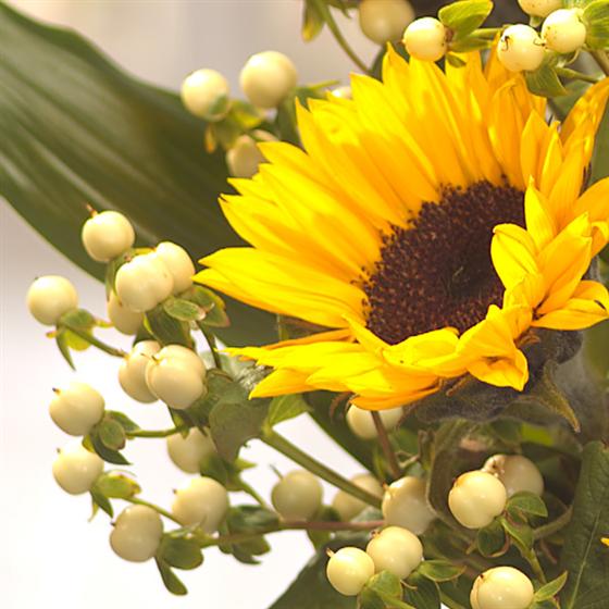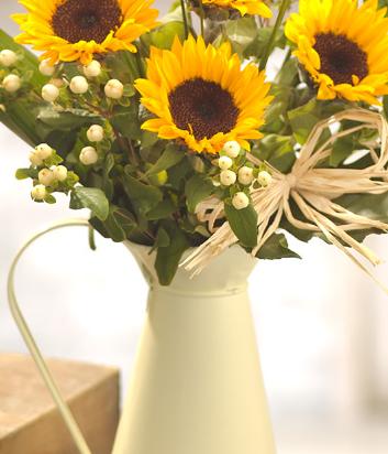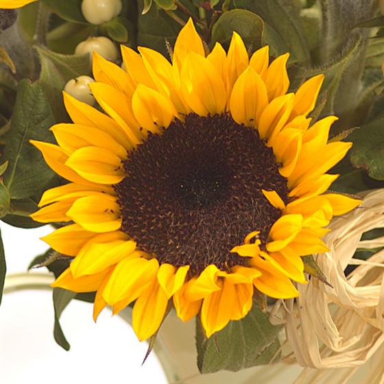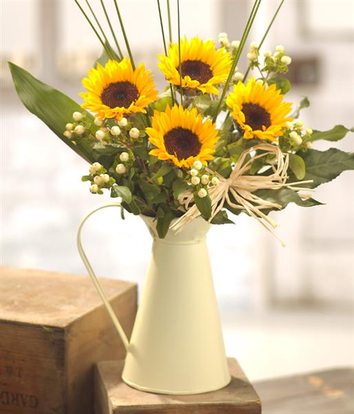 A lovely gift to represent a sunny afternoon. A cream jug filled with Sunflowers, Hypericum berries and foliage finished with a raffia bow. Please note , jugs are currently unavailable and are substituted with a vase.