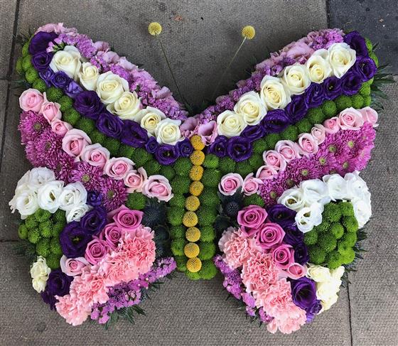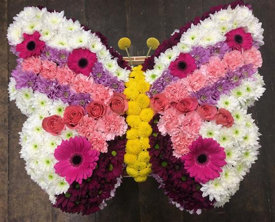 A pretty pink butterfly wreath created with pink Gerbera and Germini, white Chrysanthemums, cerise, green and lavender Carnations.